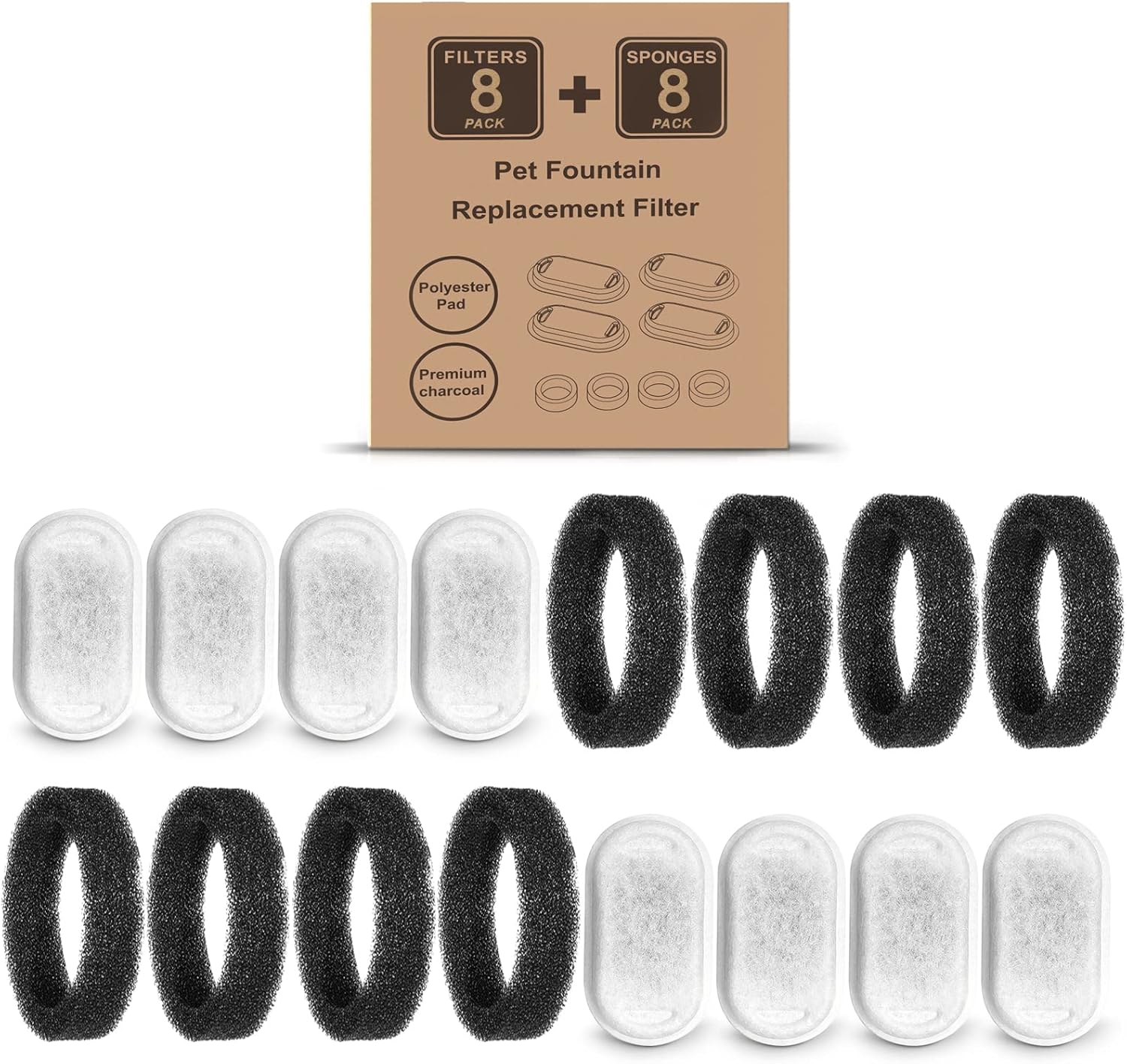 Premium Turbah Stainless Pet Fountain Replacement Filters (8 Filters + 8 Sponges)